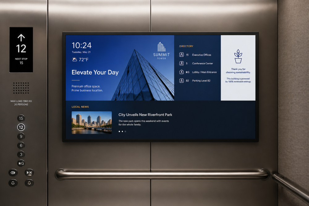 Elevators can offer a valuable opportunity to connect with occupants and visitors. Digital displays turn these everyday environments into communication platforms that share timely information and reinforce branding. With thoughtful design and proper system integration, elevator signage can improve information flow throughout an entire building.